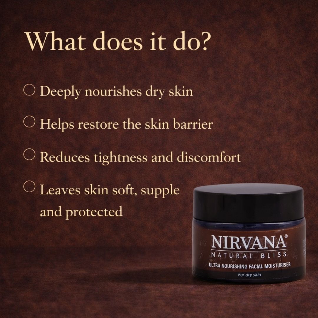 Nirvana Natural Bliss Ultra-Nourishing Facial Moisturiser is an intensely hydrating cream formulated to support dry, dehydrated, and parched skin by deeply locking in moisture, improving softness, and helping prevent further dehydration. It blends silk protein, plant oils, and botanical extracts to nourish and soothe dry skin without heaviness, leaving skin supple and comfortable.
