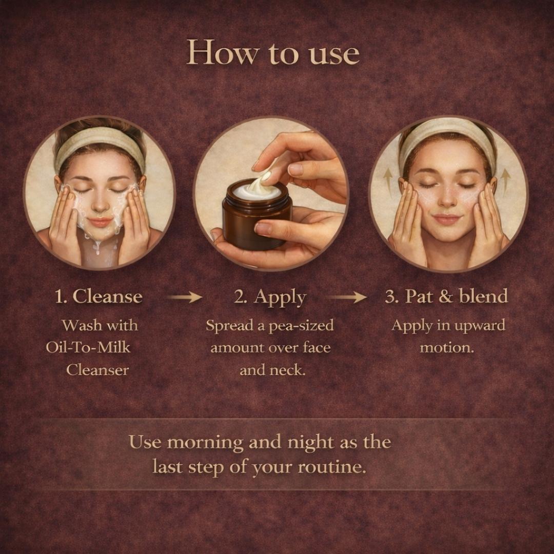After cleansing (and toning if you use a toner), apply a small amount evenly to the face and neck.